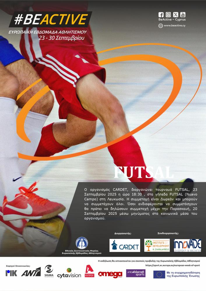 Ο οργανισμός CARDET, διοργανώνει τουρνουά FUTSAL, 23 Σεπτεμβρίου 2025 η ώρα 18:30 , στα γήπεδα FUTSAL (Νuavo Campo) στη Λευκωσία. Η συμμετοχή είναι Δωρεάν και μπορούν να συμμετέχουν όλοι. Όσοι ενδιαφέρονται να συμμετάσχουν θα πρέπει να δηλώσουν συμμετοχή μέχρι την Παρασκευή, 20 Σεπτεμβρίου 2025 μέσω μηνύματος στα κοινωνικά μέσα του οργανισμού.