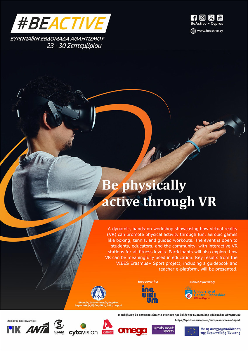 Αυτή η διαδραστική εκδήλωση διοργανώνεται από την INQUIRIUM Ltd και το UCLan Cyprus στο πλαίσιο του έργου VIBES (Virtual Reality Sports Interaction Between European Schools) του προγράμματος Erasmus+.