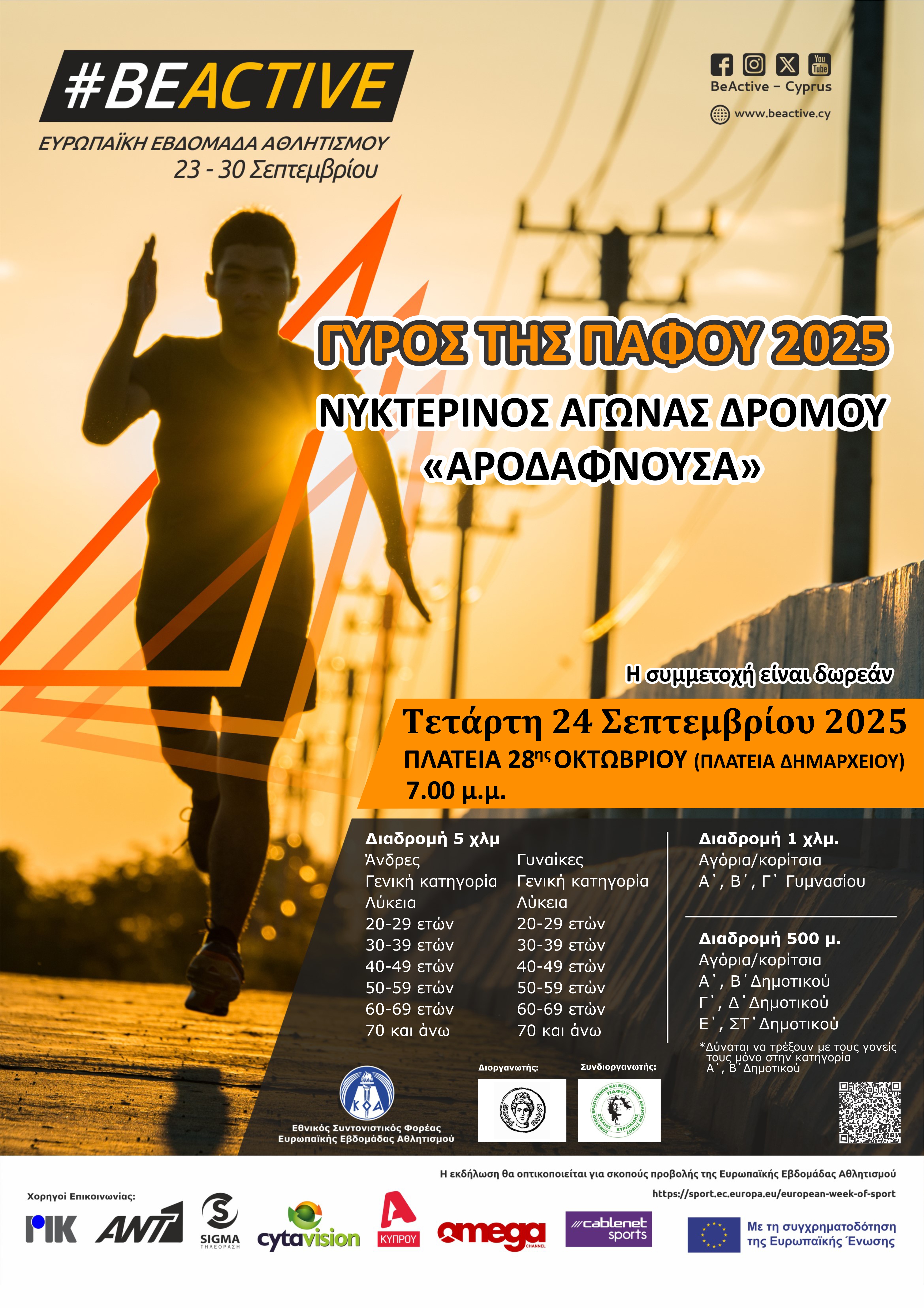 Η Ευρωπαϊκή Εβδομάδα Αθλητισμου ξεκινά δυναμικά με τον εντυπωσιακό αγώνα δρόμου "Αροδαφνούσα" ο οποίος έχει καταστεί θεσμός τα τελευταία 4 χρόνια. Η μαγεία της πόλης μας αναδεικνύεται μέσα απο αυτή τη βραδινή διαδρομή. Παράλληλα διοργανώνεται ο Γύρος της Πάφου, όπου άτομα κάθε ηλικίας μπορούν να συμμετάσχουν σε διαφορετικές διαδρομές. Η διαδρομή "Άροδαφνούσα" και ο Γύρος της Πάφουν δίνουν την ευκαιρία στους συμμετέχοντες να τρέξουν υπό το βραδινό φως απολαμβάνοντας της πόλη μας. Μαζί όλες οι διαδρομές αποτελούν μια αθλητική εμπειρία προσβάσιμη σε άτομα όλων των ηλικιών.