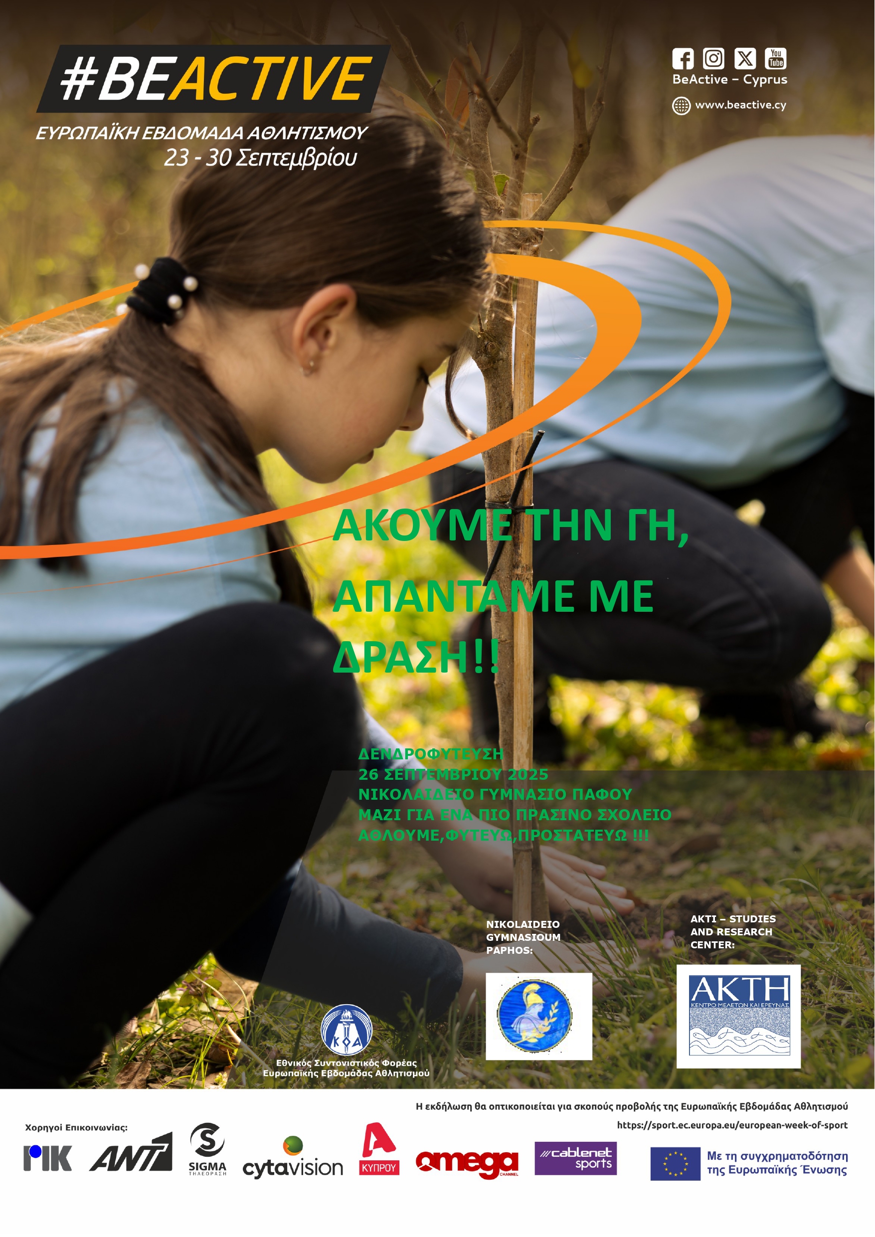 ΣΤΟ ΝΙΚΟΛΑΙΔΕΙΟ ΓΥΜΝΑΣΙΟ ΠΑΦΟΥ ΤΗΝ ΗΜΕΡΑ ΤΗΣ ΕΥΡΩΠΑΙΚΗΣ ΕΒΔΟΜΑΔΑΣ ΑΘΛΗΤΙΣΜΟΥ ΜΑΖΙ ΜΕ ΤΟΥΣ ΜΑΘΗΤΕΣ, ΘΑ ΠΡΑΓΜΑΤΟΠΟΙΗΘΕΙ : ΚΑΘΑΡΙΟΤΗΤΑ ΧΟΡΩΝ, ΚΛΑΔΕΜΑ ΔΕΝΤΡΩΝ ΚΑΙ ΔΕΝΔΡΟΦΥΤΕΥΣΗΣ ΣΕ ΣΥΓΚΕΚΡΙΜΕΝΟ ΧΩΡΟ ΤΟΥ ΣΧΟΛΕΙΟΥ,ΑΦΗΝΟΝΤΑΣ ΠΙΣΩ ΕΝΑ '' ΠΡΑΣΙΝΟ ΑΠΟΤΥΠΩΜΑ '' ΓΙΑ ΤΙΣ ΕΠΟΜΕΝΕΣ ΓΕΝΙΕΣ.